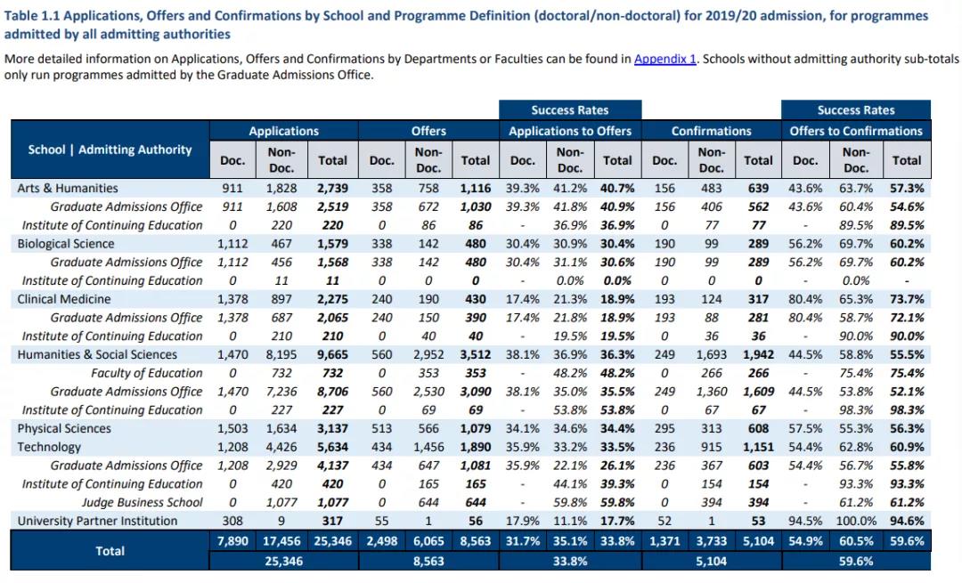 研究生方面,剑桥大学网站上公布的最新数据是2019/20入学季的,全球共计25,346份申请,总发放录取数8,563份。硕博课程的申请比例为11︰5。申请量最大的是人文与社会科学学院和科技学院。详见下图。