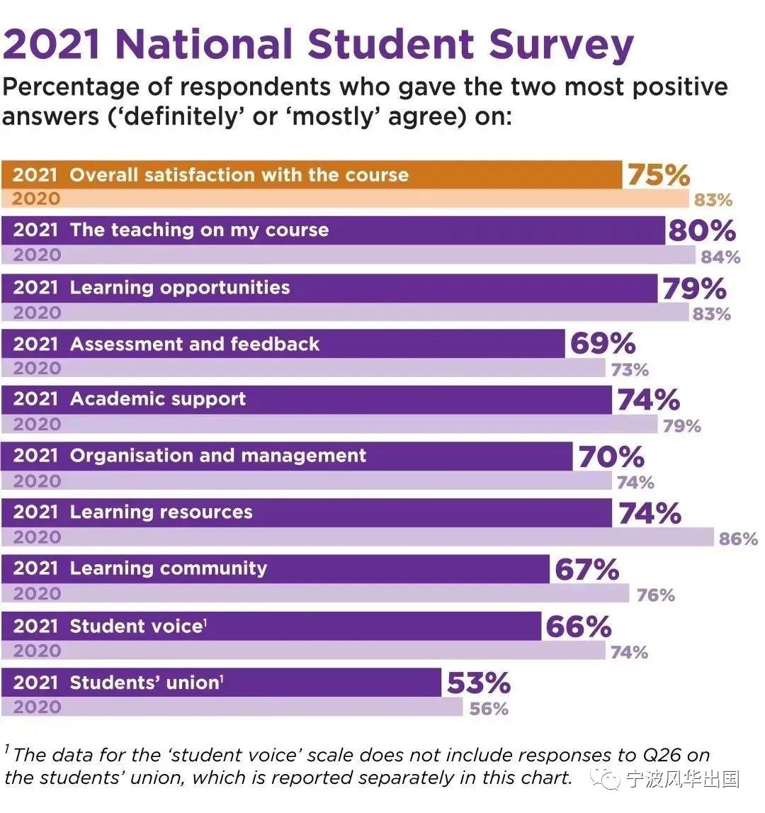 1 英国最近发布了2021年全国大学学生满意度调查(National Student Survey)的调查结果。此次,NSS调查了全英4个地区的397所大学、33万名在校本科在读生的看法、意见。