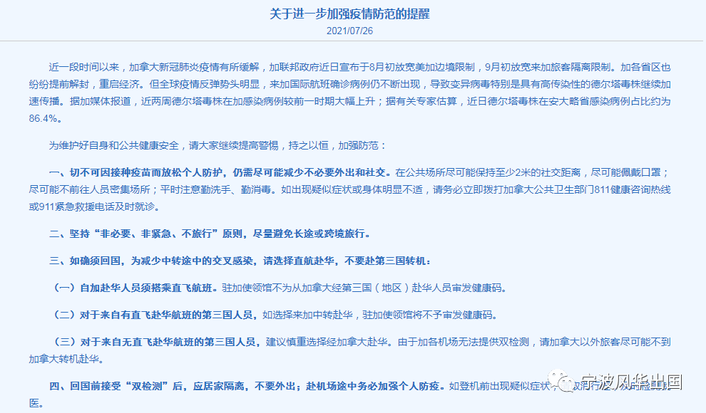大使馆表示,近期加拿大即将放宽美加边境限制,但目前全球疫情反弹势头明显,来加国际航班确诊病例仍不断出现,因此大家切不可因接种疫苗而放松个人防护,仍需尽可能减少不必要外出和社交。此外,仍要坚持“非必要、非紧急、不旅行”原则,尽量避免长途或跨境旅行。如确须回国,为减少中转途中的交叉感染,请选择直航赴华,不要赴第三国转机。