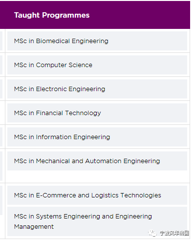 学院目前开设8个全日制授课型硕士项目,为期1年,涵盖生物医学工程、计算机科学、电子工程、金融技术、信息工程、机械与自动化工程、电子商务与物流技术、系统工程与工程管理等专业。所有专业均要求申请人具备相关背景,雅思6.5,无需提供GMAT/GRE成绩。